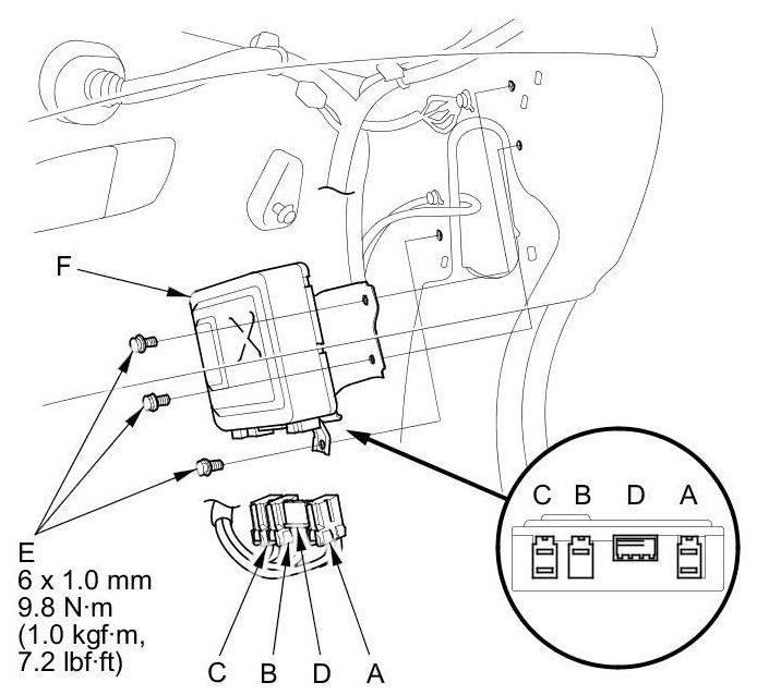 3. Disconnect EPS control unit connector A (2P), connector B (2P), connector C (2P), and connector D (28P).