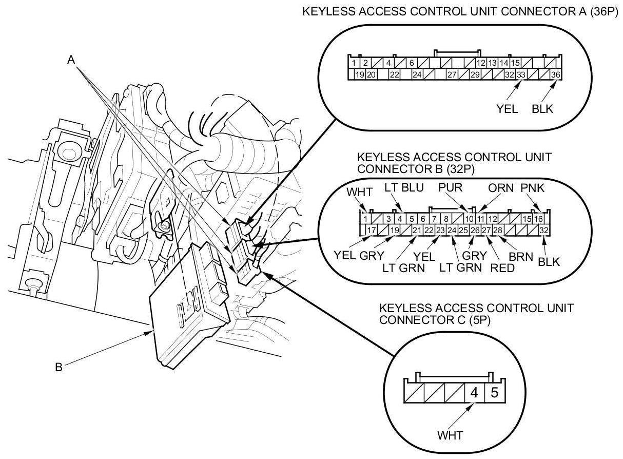 3. Disconnect the connectors (A) from the keyless access control unit (B).