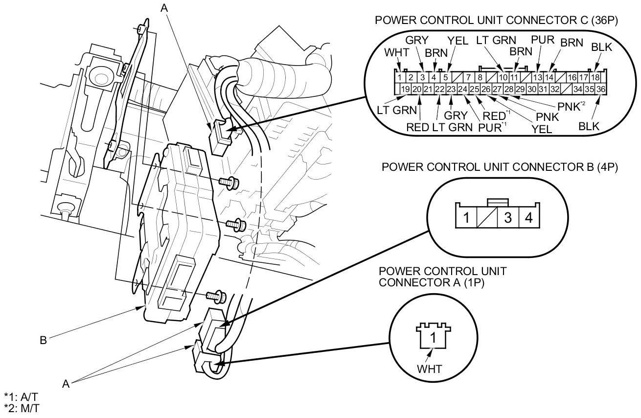9. Disconnect the connectors (A) from the power control unit (B).