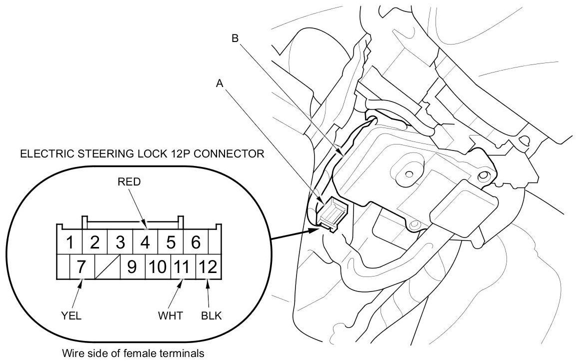 15. Disconnect the connector (A) from the electric steering lock (B).