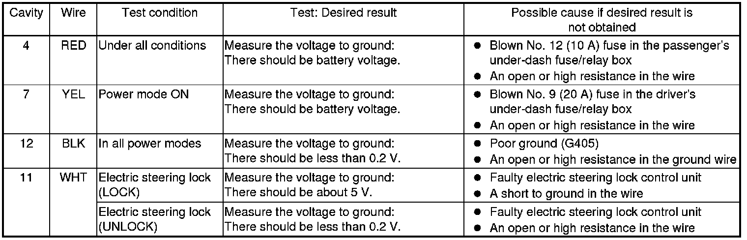 17. Reconnect the connector to the electric steering lock, and do the following input tests: