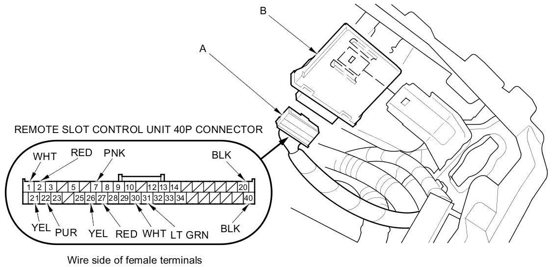 20. Disconnect the connector (A) from the remote slot control unit (B).
