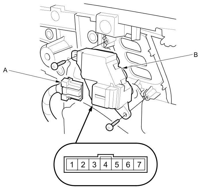 2. Disconnect the 7P connector (A) from the driver's position memory switch (B).