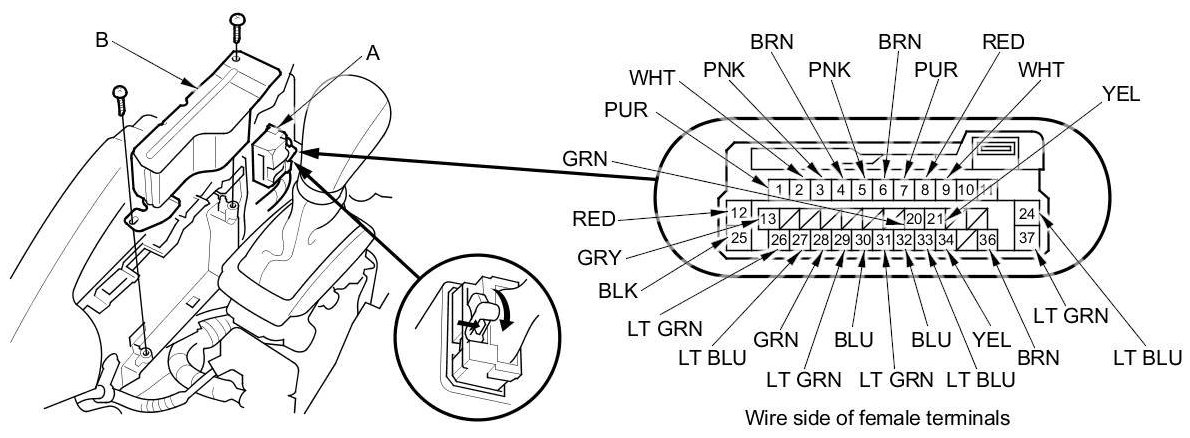 2. Disconnect the 37P connector (A) from the seat ventilation control unit (B).