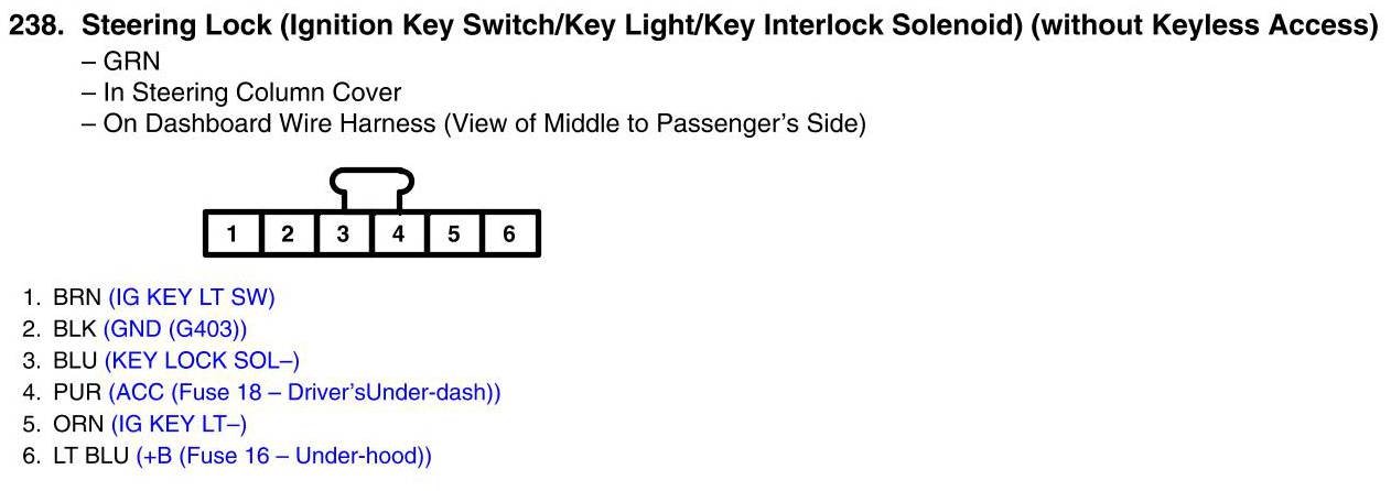 View 238 - Steering Lock (Ignition Key Switch/Key Light/Key Interlock Solenoid) (Without Keyless Access) Connector View