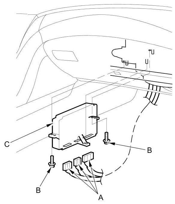 2. Disconnect the connectors (A). Remove the bolts (B) and the climate control unit (C).