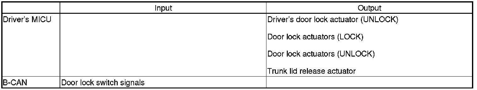 The driver's MICU controls the door lock actuators LOCK, UNLOCK, DRIVER'S UNLOCK, TRUNK UNLOCK based on B-CAN door lock switch signals.