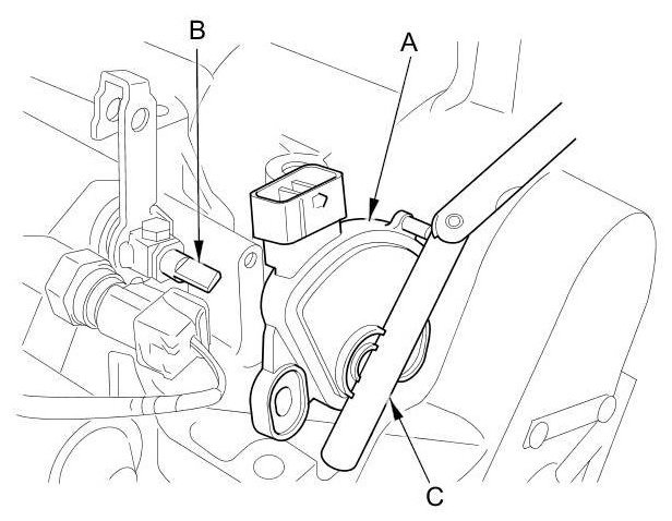 9. Install the transmission range switch (A) gently on the selector control shaft (B) while holding it in the N position with the 2.0 mm (0.079 in) blade (C).