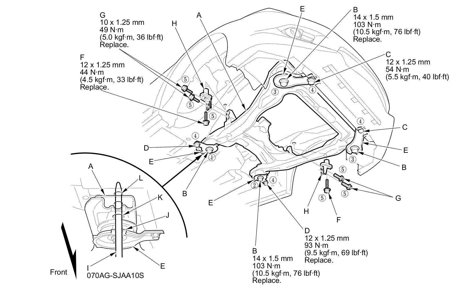 After removing the front subframe mounting bolts, the front subframe middle rubber mount mounting bolts, the front subframe rear stiffener mounting bolts, the rear engine mounting base bracket mounting bolts, and the rear engine mounting upper base bracket mounting bolt, be sure to replace them with new ones.