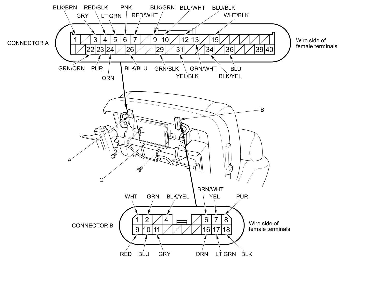 3. Disconnect the 40P connector (A) and 18P connector (B) from the power seat control unit (C).