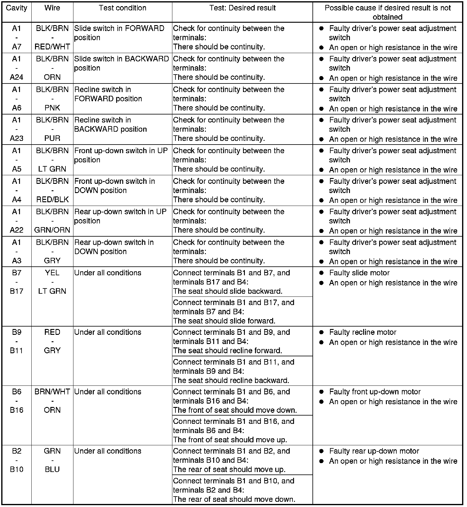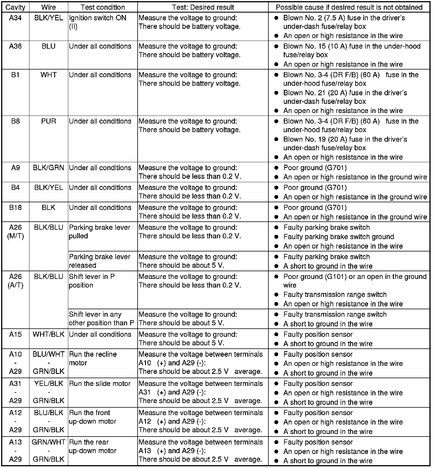 7. Disconnect the connectors from the power seat control unit, and do the following input tests: