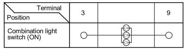 5. Check for continuity between cruise control combination switch 12P connector terminal No. 3 and No. 9 according to the table.