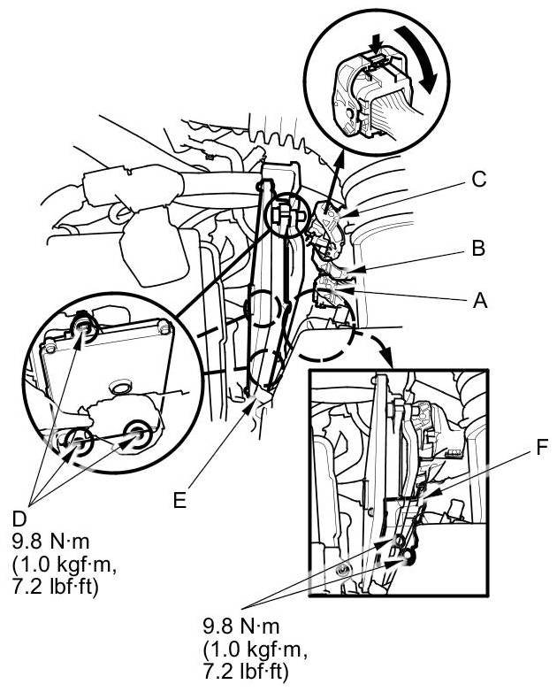 - Canada model: When disconnecting the ECM/PCM connectors, remove the ECM/PCM sub bracket (F).