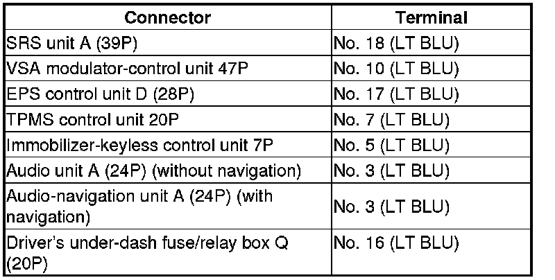 Repair a short in the wire between the DLC No. 7(K-line) and the VSA modulator-control unit, the EPS control unit, the SRS unit, the TPMS control unit, the immobilizer-keyless control unit, the audio unit, or the driver's under-dash fuse/relay box.
