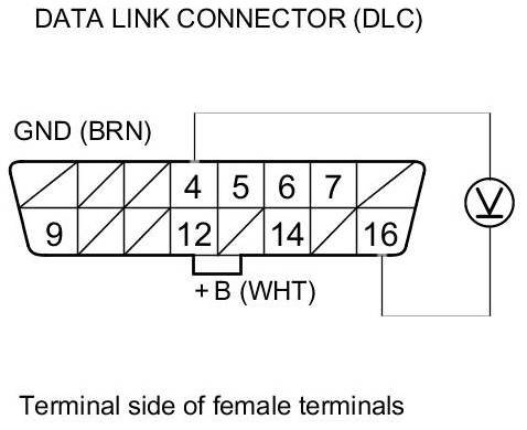26. Measure the voltage between DLC terminal No. 16 and body ground.