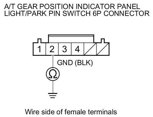 17. Check for continuity between A/T gear position indicator panel light/park pin switch 6P connector terminal No. 2 and body ground.