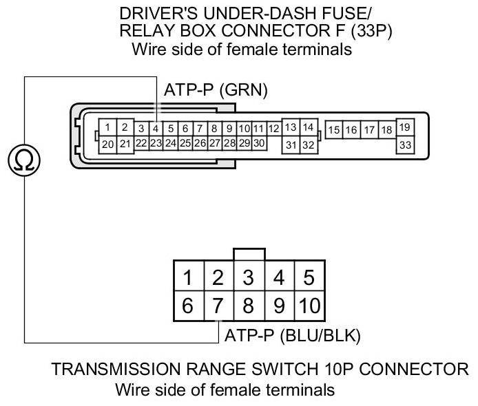 21. Check for continuity between driver's under-dash fuse/relay box connector F (33P) terminal No. 4 and transmission range switch 10P connector terminal No. 7.
