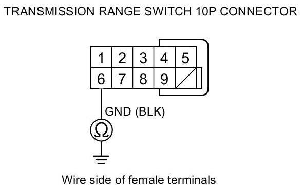 22. Check for continuity between transmission range switch 10P connector terminal No. 6 and body ground.