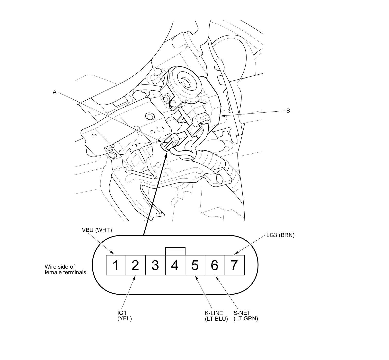 2. Disconnect the 7P connector (A) from the immobilizer-keyless control unit (B).