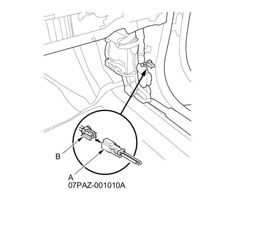 3. Connect the SCS service connector (A) to the navigation service check connector (B) located by the passenger's kick panel.