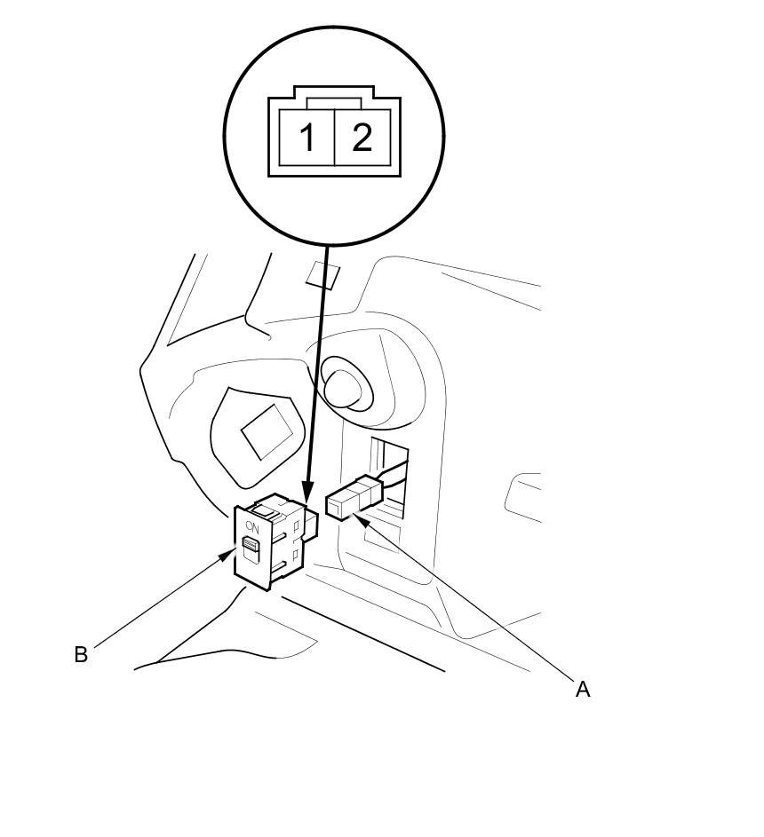 2. Disconnect the 2P connector (A) from the keyless access system mode switch (B).