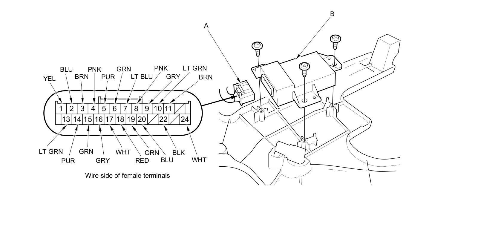 3. Disconnect the 24P connector (A) from the power mirror control unit (B).