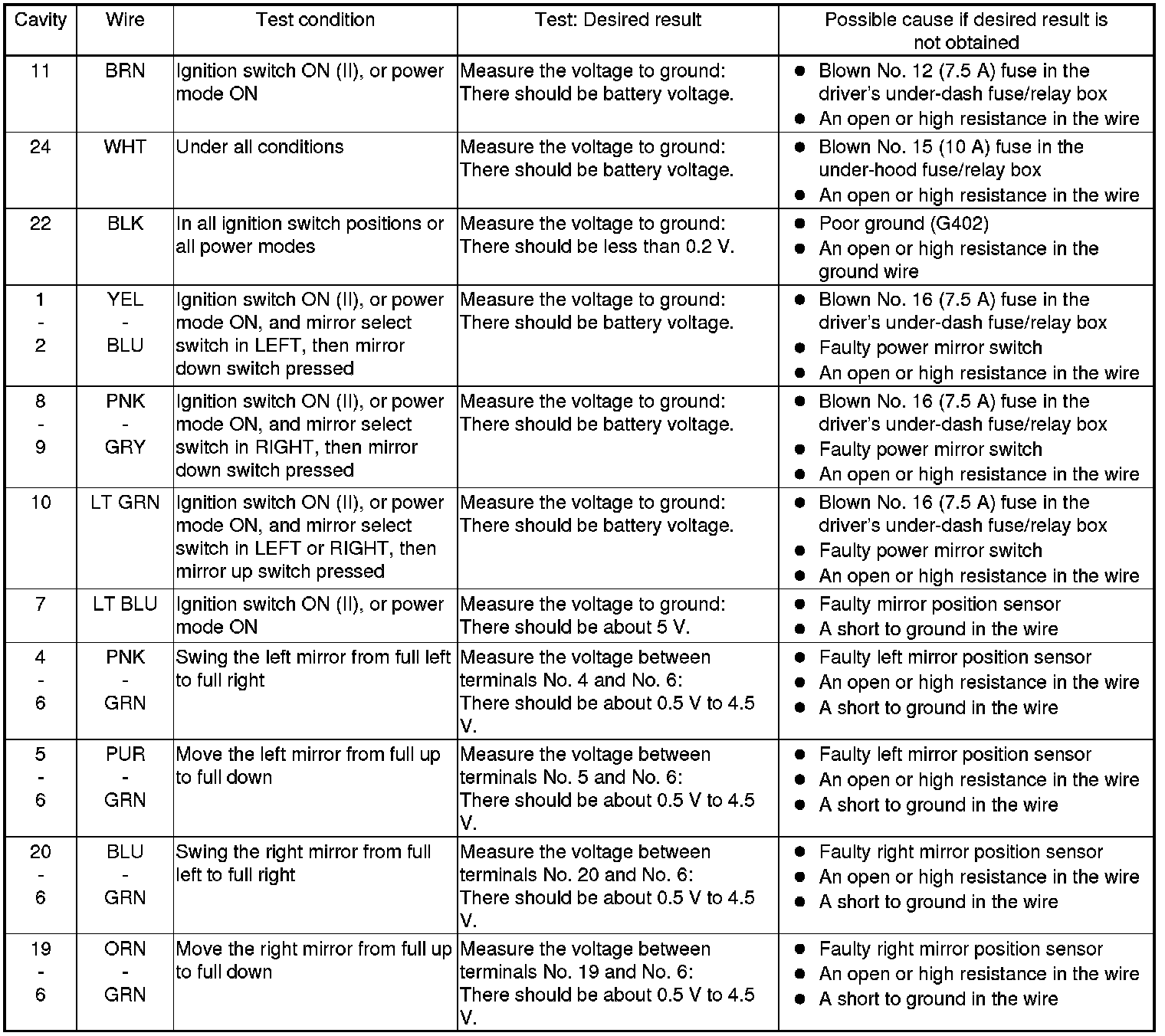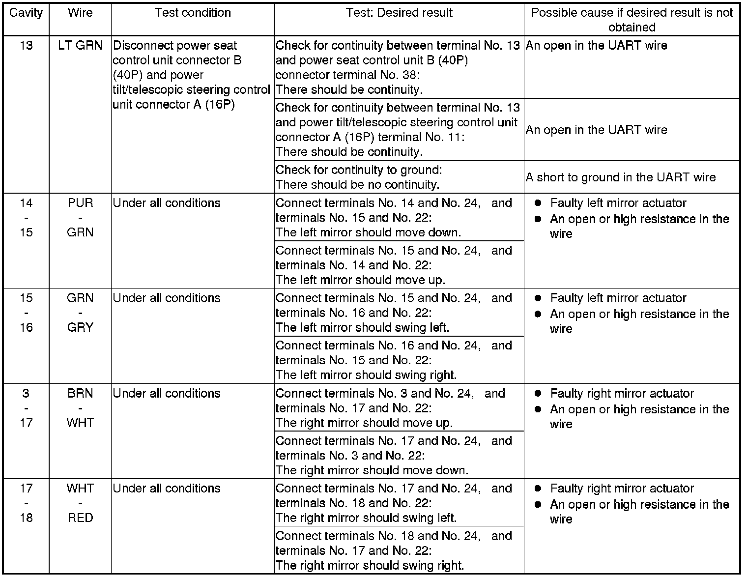 7. Disconnect the connectors from the power mirror control unit, and do the following input tests.