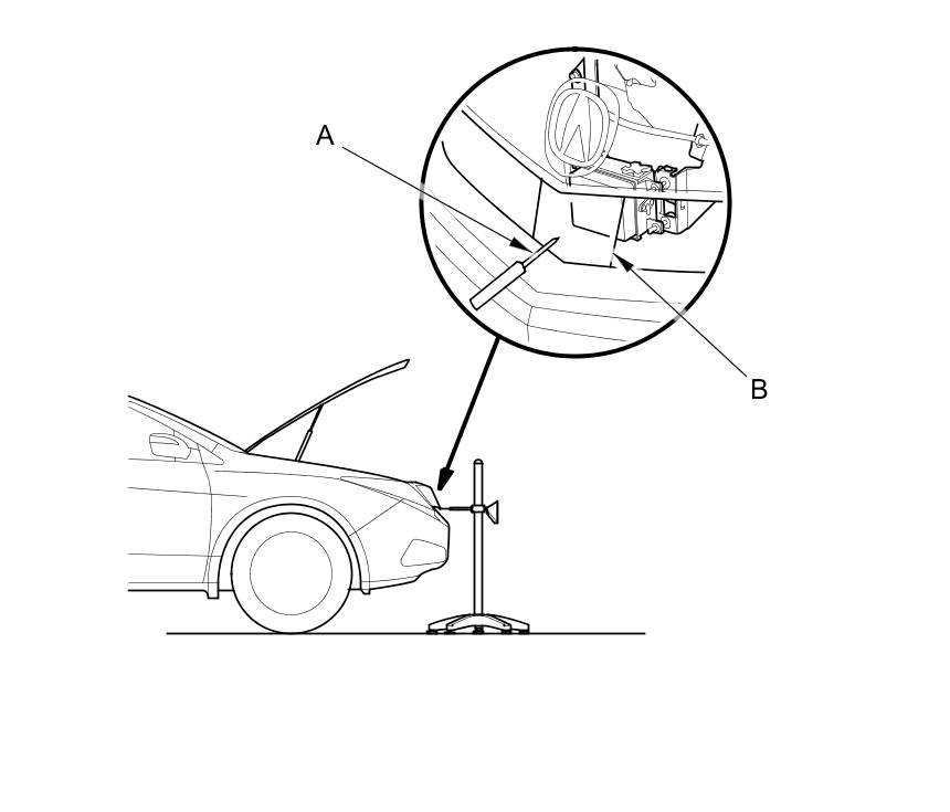 5. Adjust the tip of the height rod (A) on the target to the center of the front grille radar cover (B).