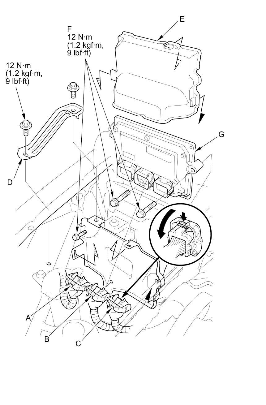 12. Loosen or remove the bolts (F), and remove the PCM (G).