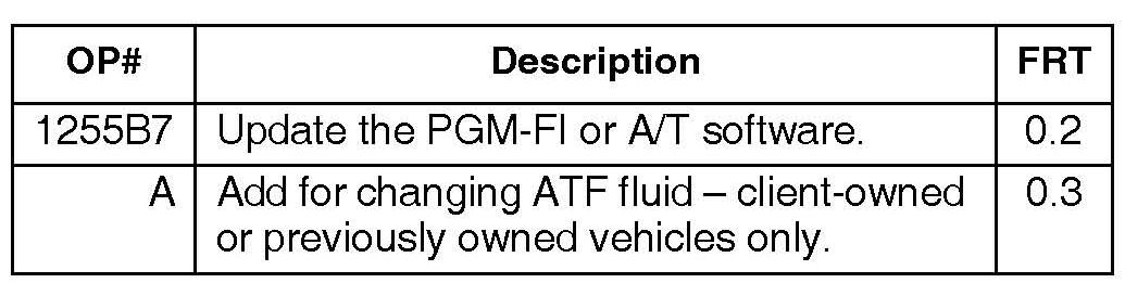 Update the PGM-FI or the A/T software. Then, if the vehicle is client-owned or previously owned, replace the ATF.