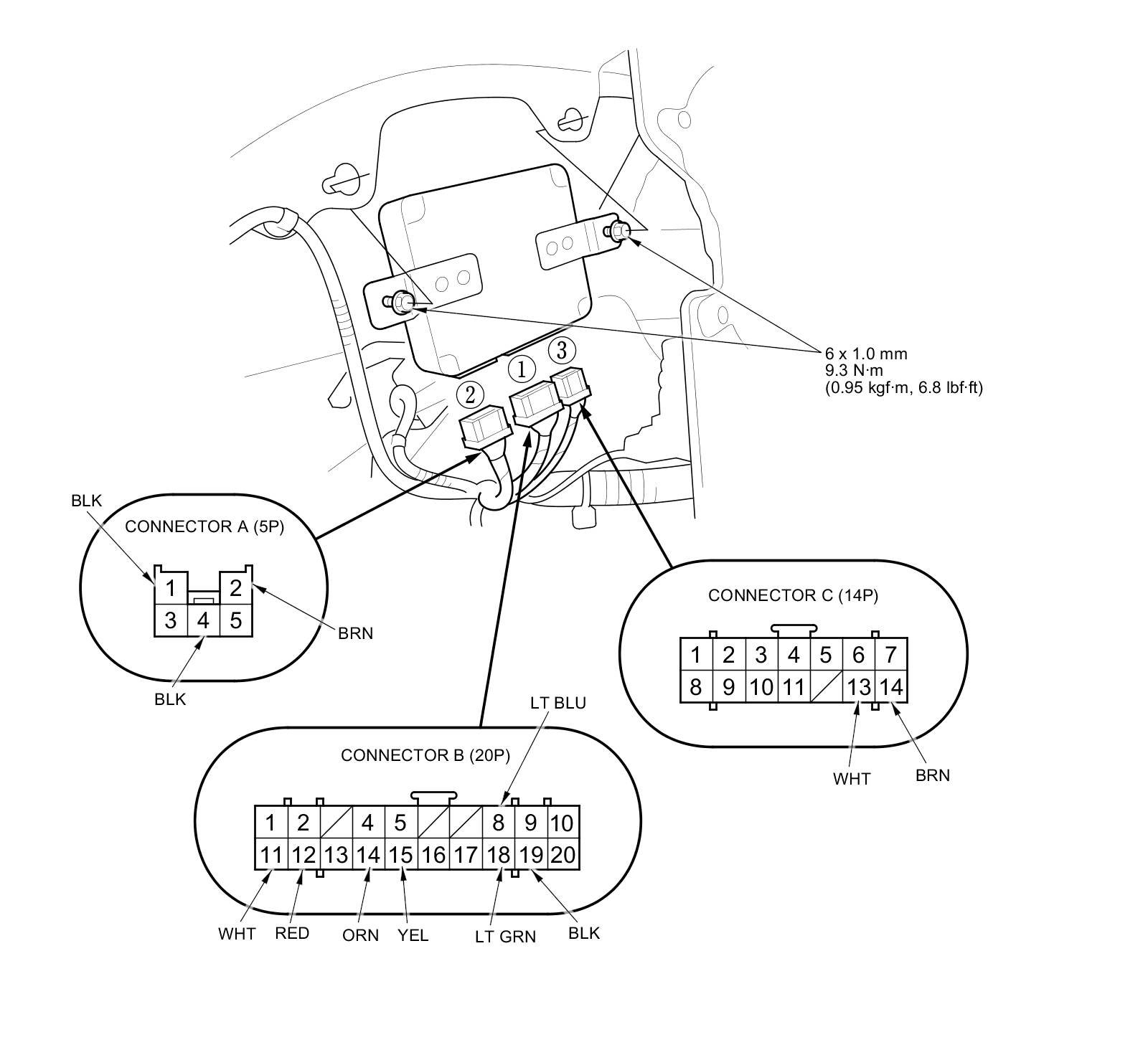 3. Disconnect power tailgate control unit connectors A (5P), B (20P), and C (14P) in the order shown.