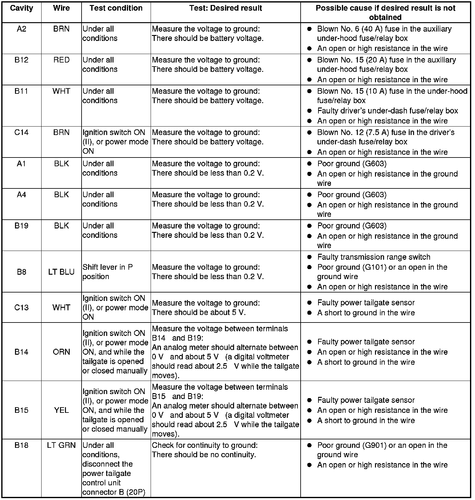 NOTE: Before testing the power tailgate control unit, troubleshoot the multiplex integrated control system first using B-CAN System Diagnosis Test Mode A Troubleshooting - B-CAN System Diagnosis Test Mode A.