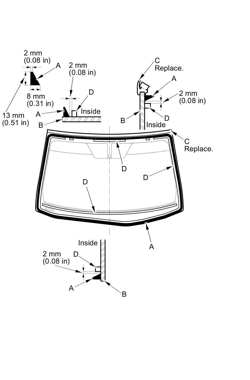 21. Put the cartridge in a caulking gun, and run a continuous bead of the adhesive (A) on the windshield (B) along the edge of the windshield upper molding (C) and the rubber dams (D) as shown: