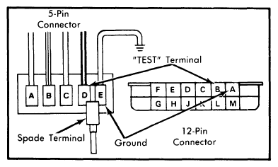 - Turn ignition on (engine off). "CHECK ENGINE" lamp should glow. Locate Assembly Line Data Link (ALDL) connector attached to ECM wiring harness under instrument panel. Insert lug terminal across "TEST" terminal and "GROUND" terminal. See Fig 1.NOTE: Early model "J" cars are equipped with a 5-pin ALDL connector. Later model "J" cars and all other models are equipped with a 12-pin connector.