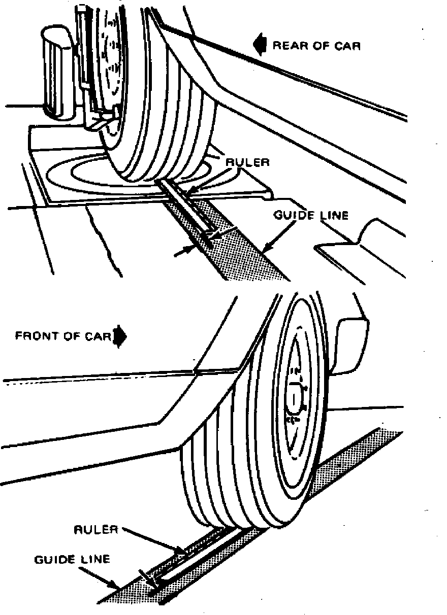 c. Place a ruler at same rib of tire at front and rear of vehicle, then measure distance from inside edge of ruler to edge of guide line, Fig. 4. When vehicle is square, measurement from guide line to ruler should be greater at rear tire by approximately 5/8 inch.