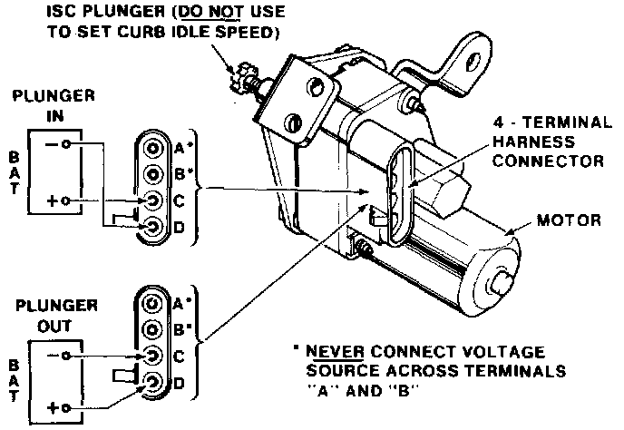 NOTE: Do not leave battery voltage connected to ISC motor longer than necessary to retract solenoid plunger. Do not connect battery voltage to terminals "A" or "B" on motor. ISC motor will be damaged if connections are improperly made.