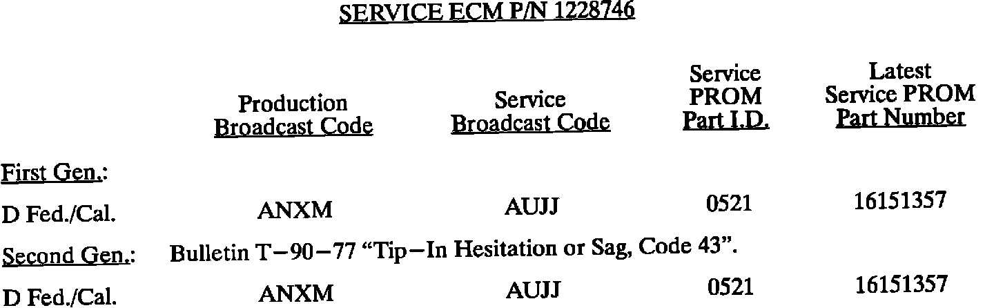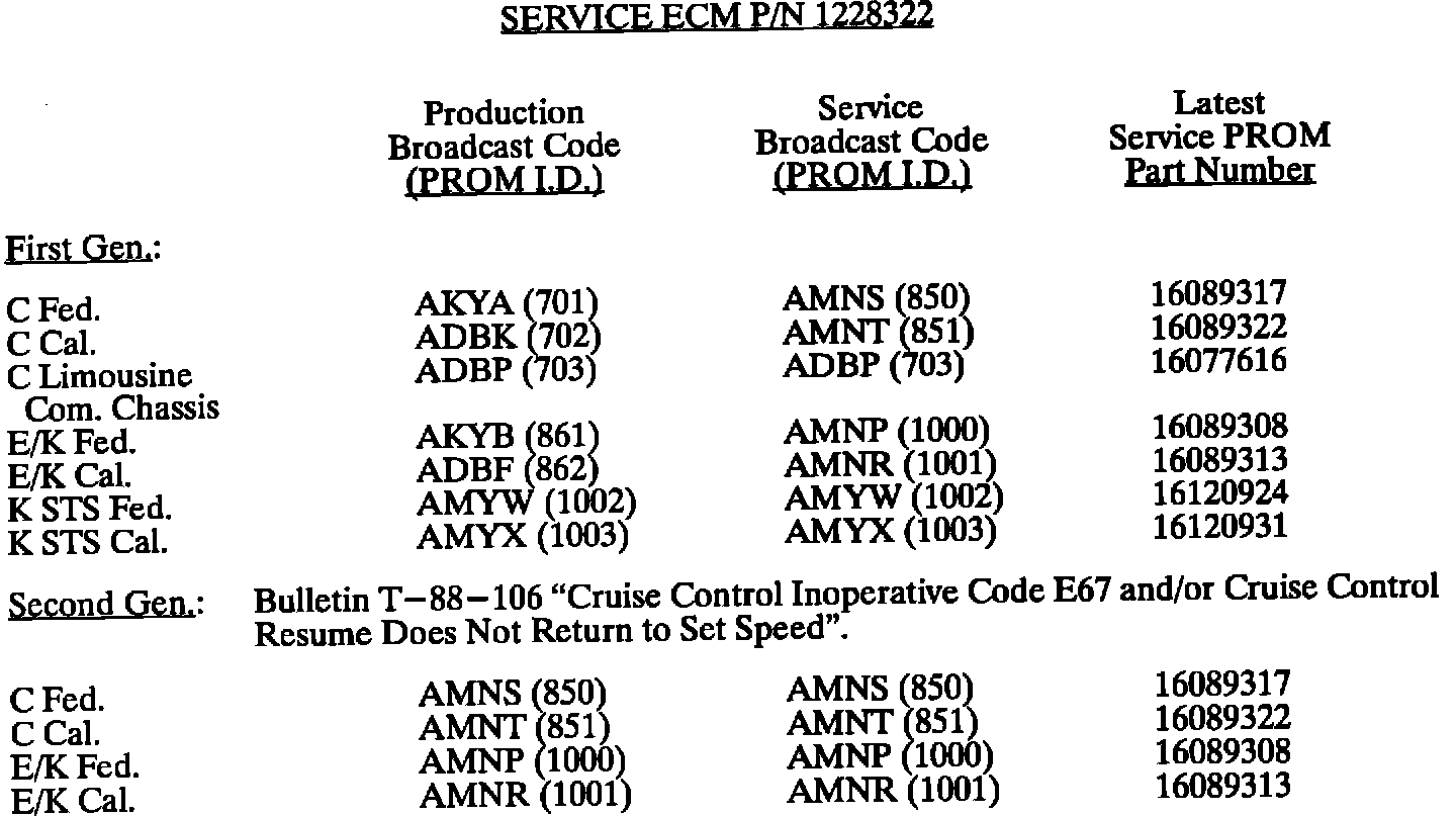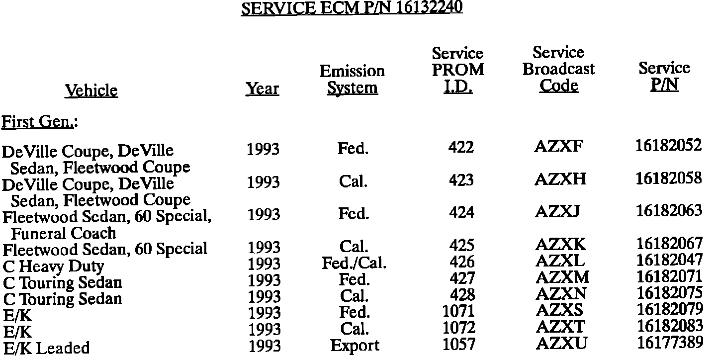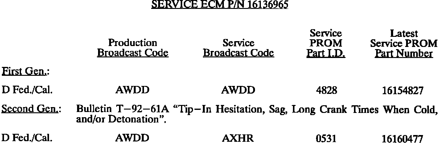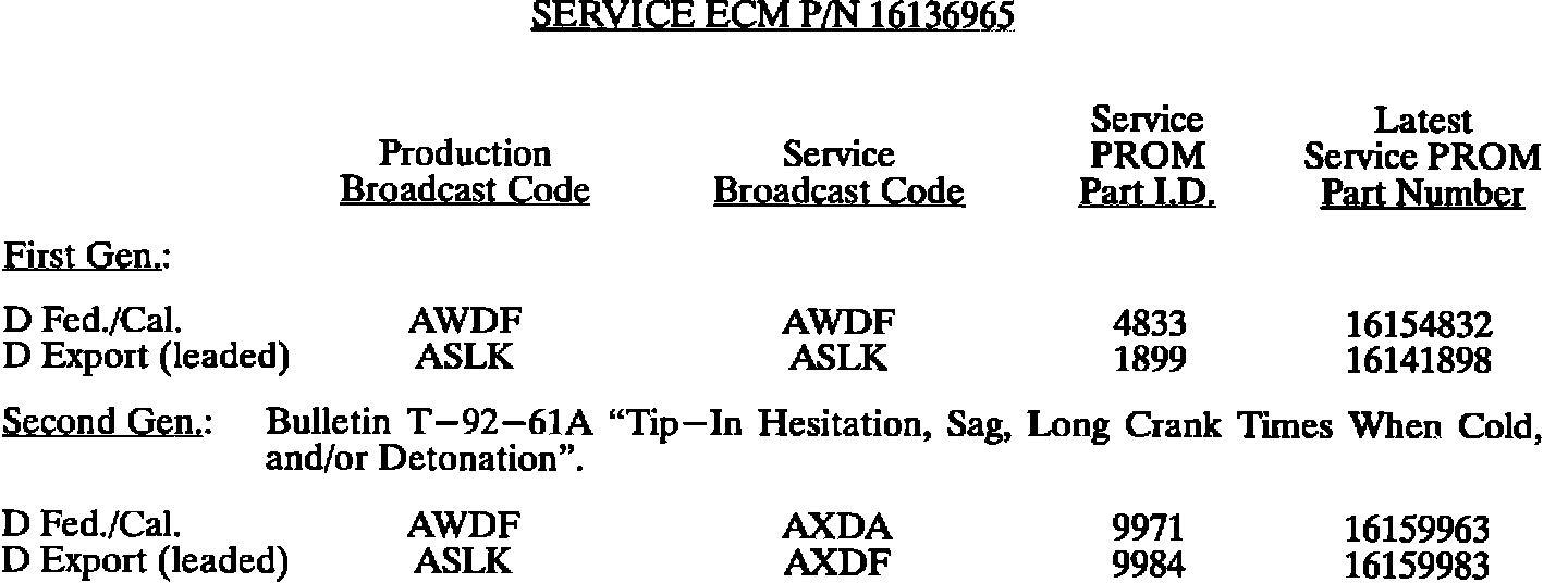 This bulletin summarize all 1980 through 1993 C, D, E, K, V, and J gasoline engine PROM calibrations to date. When any diagnosis leads to PROM replacement, the service PROM part number listed should be used. Should any additional PROM calibration changes be made, the GMSPO parts distribution system will automatically supersede these service part numbers.
