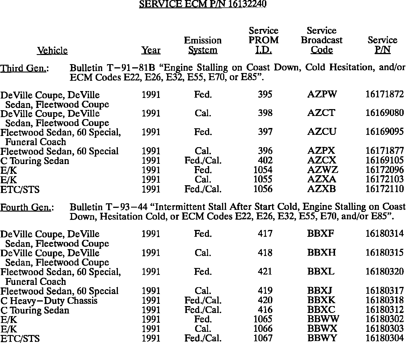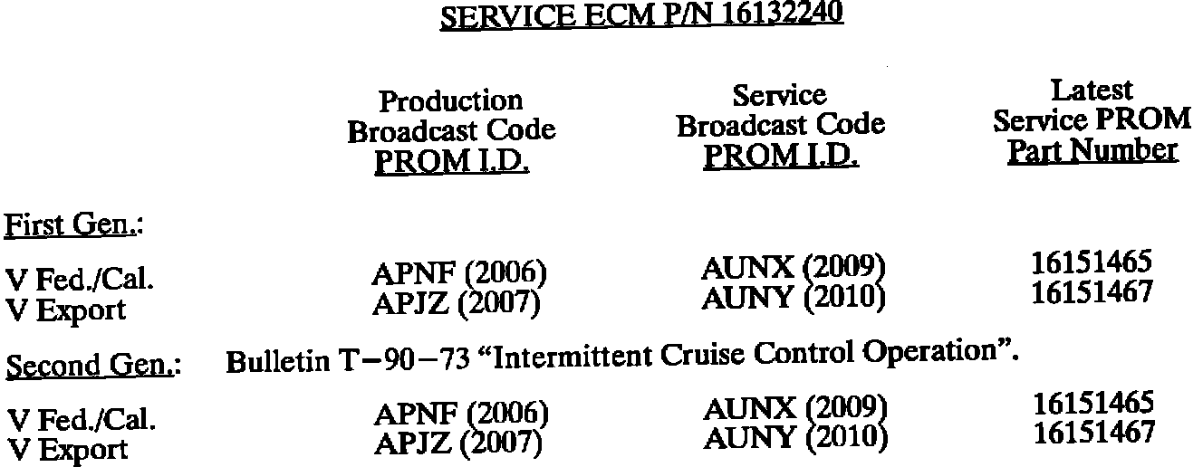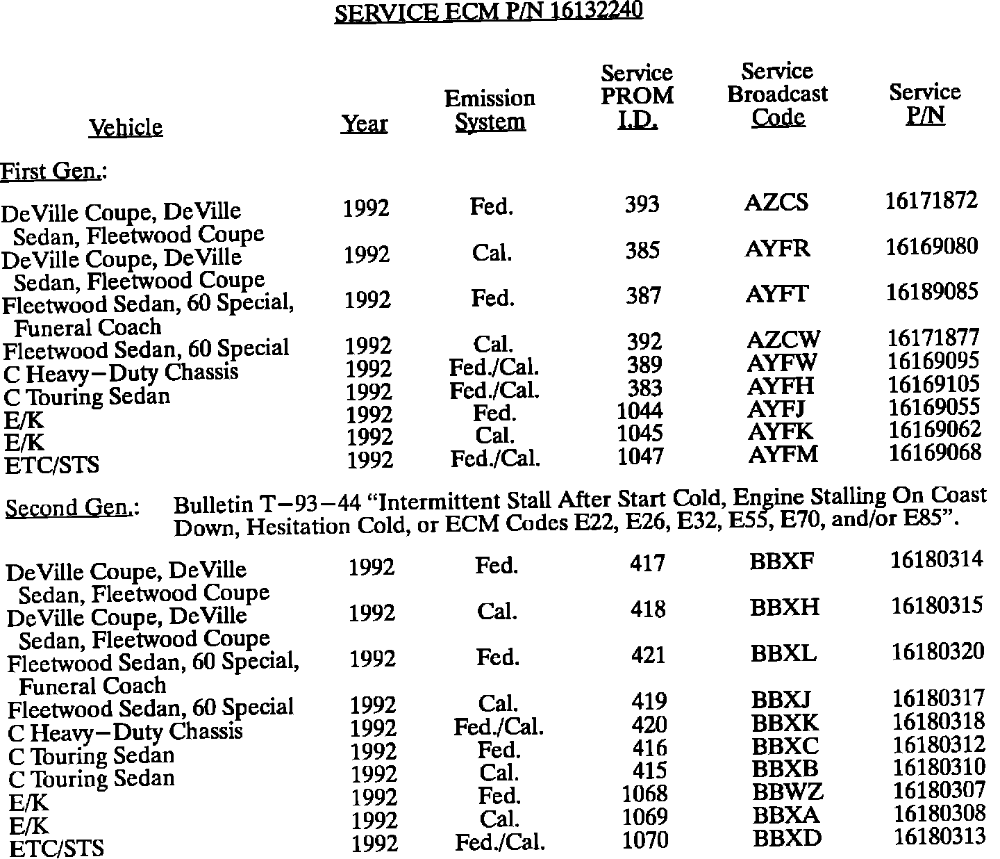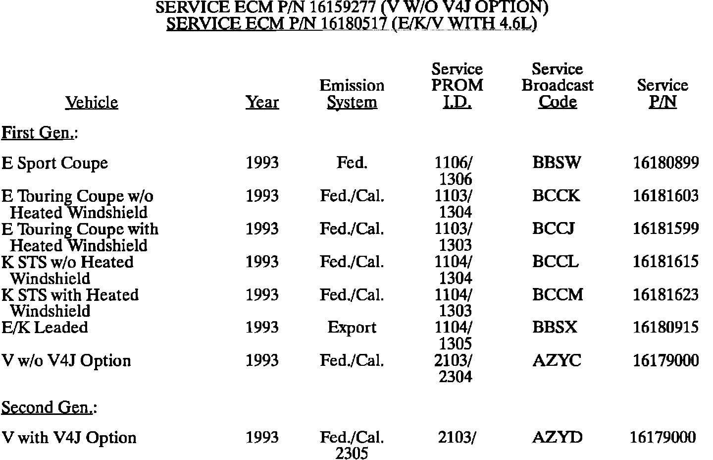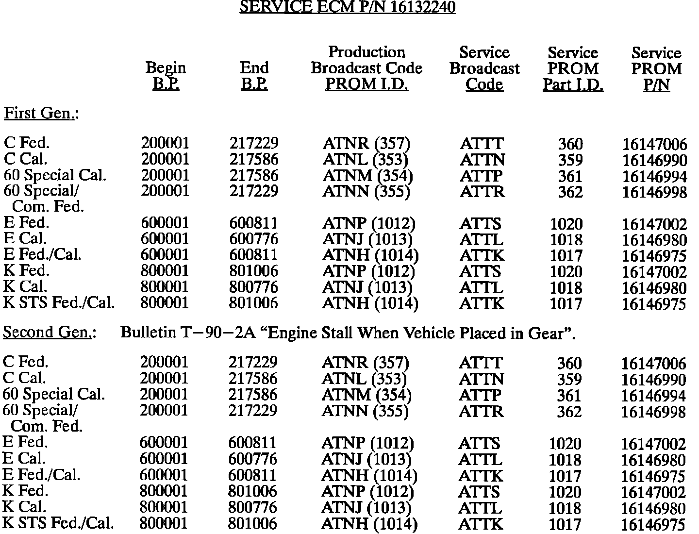 This bulletin summarize all 1980 through 1993 C, D, E, K, V, and J gasoline engine PROM calibrations to date. When any diagnosis leads to PROM replacement, the service PROM part number listed should be used. Should any additional PROM calibration changes be made, the GMSPO parts distribution system will automatically supersede these service part numbers.