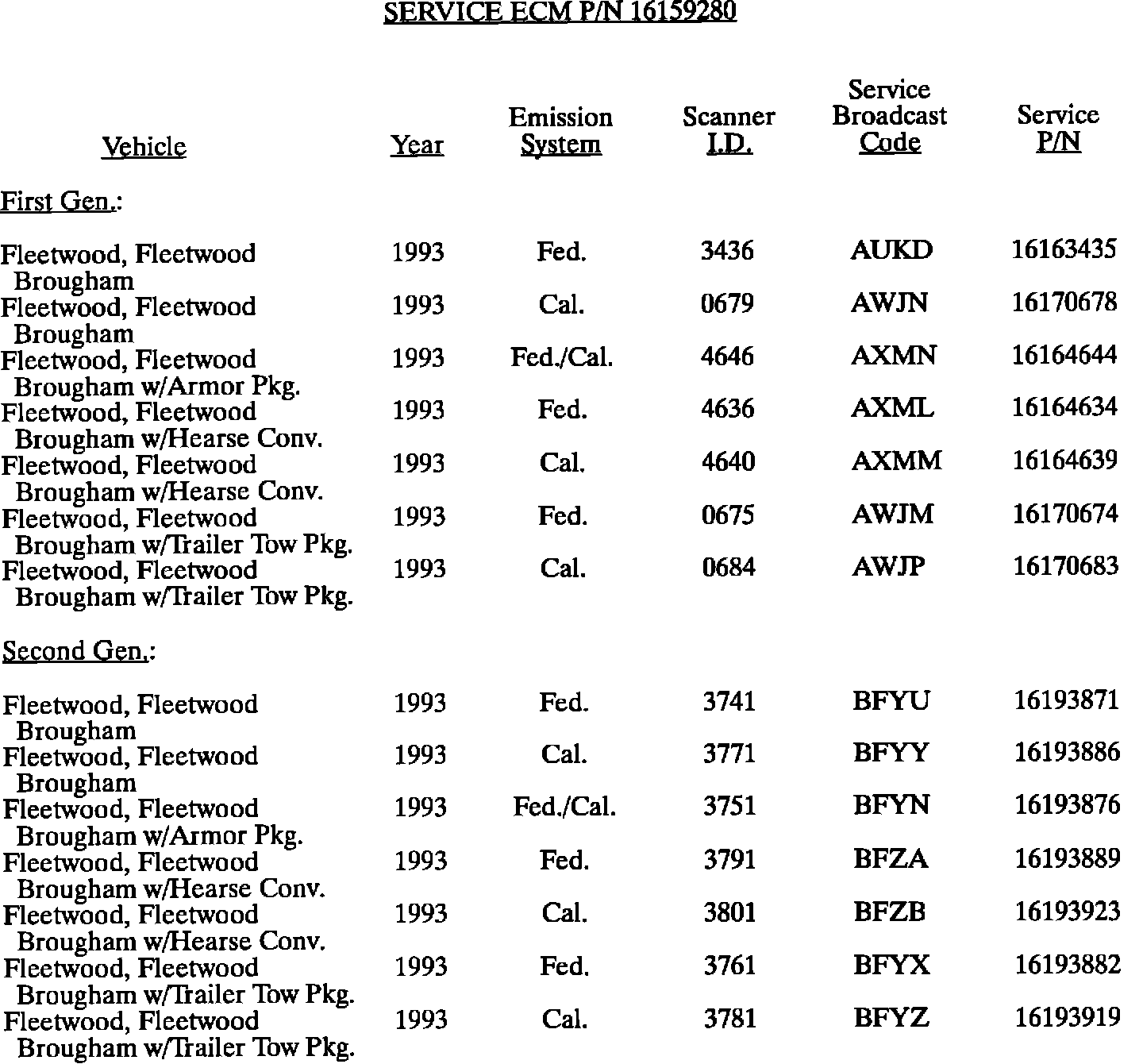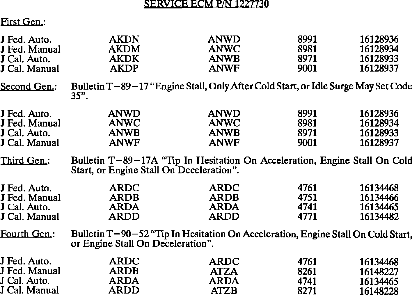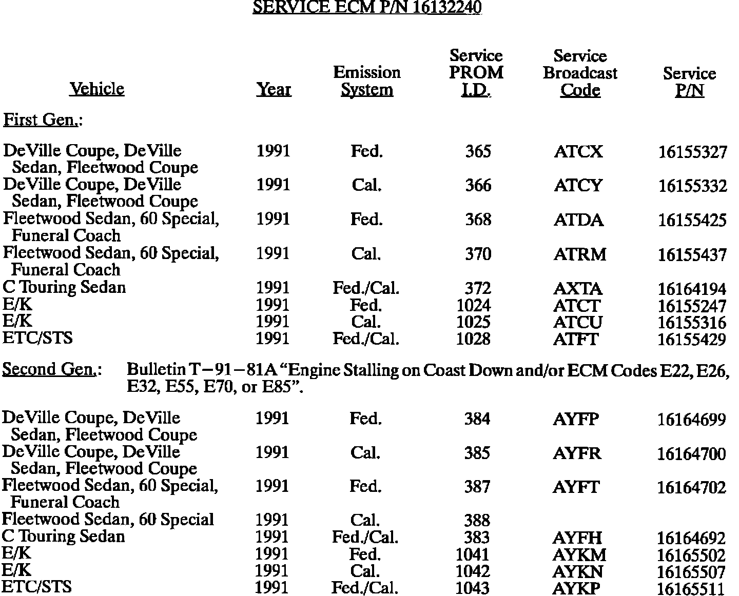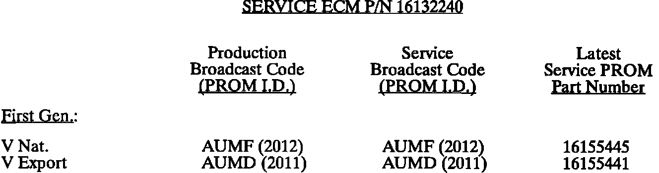 This bulletin summarize all 1980 through 1993 C, D, E, K, V, and J gasoline engine PROM calibrations to date. When any diagnosis leads to PROM replacement, the service PROM part number listed should be used. Should any additional PROM calibration changes be made, the GMSPO parts distribution system will automatically supersede these service part numbers.