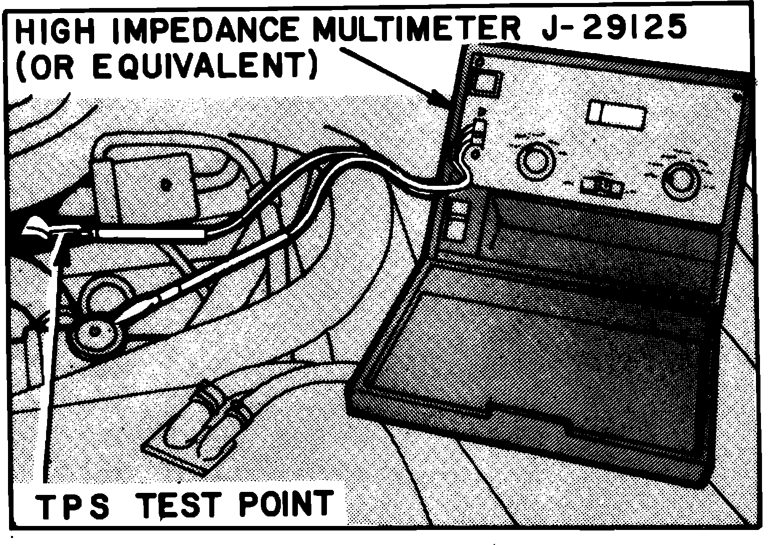9. Reconnect TPS, then connect suitable digital voltmeter to TPS harness test point, Fig. 39, as follows: