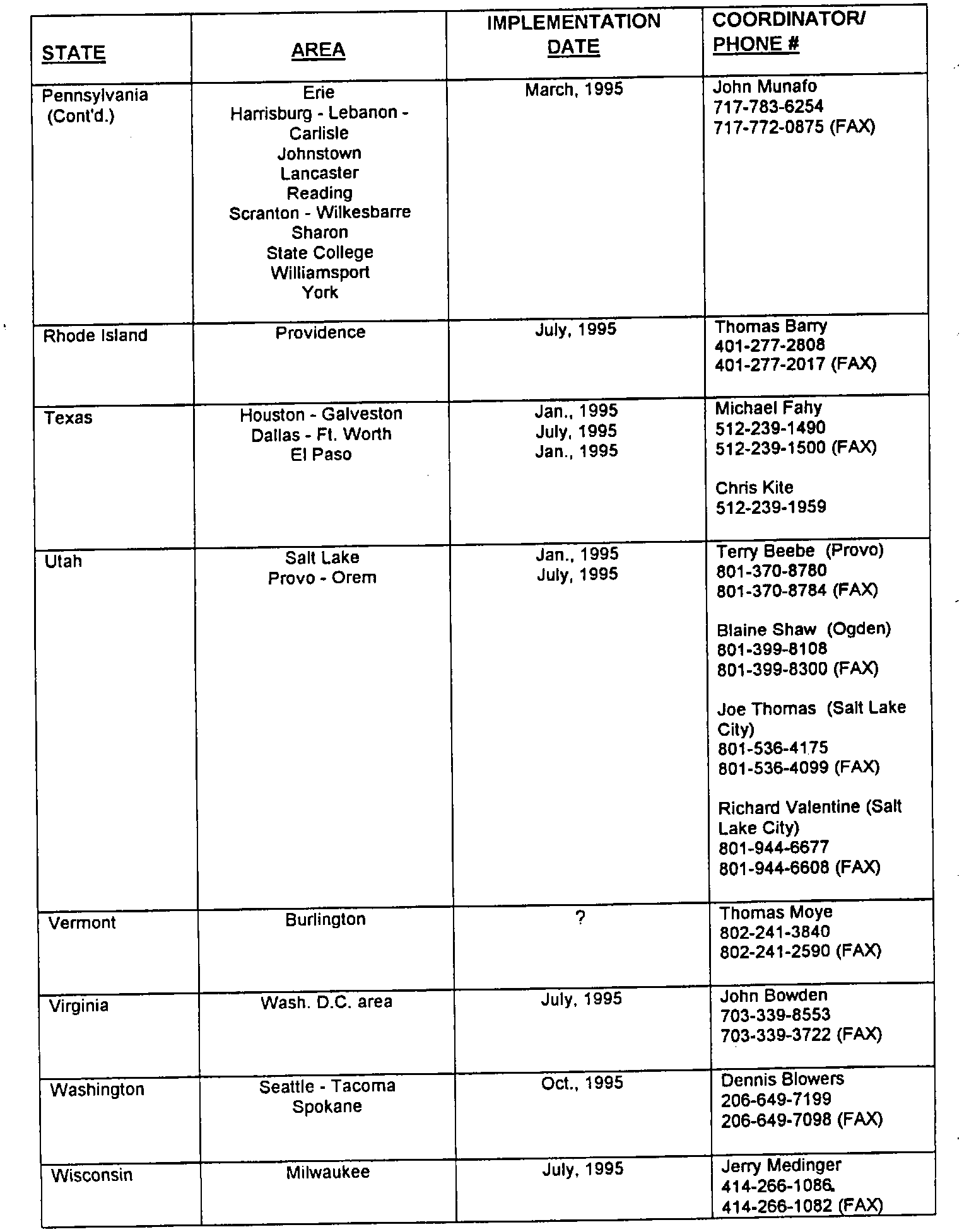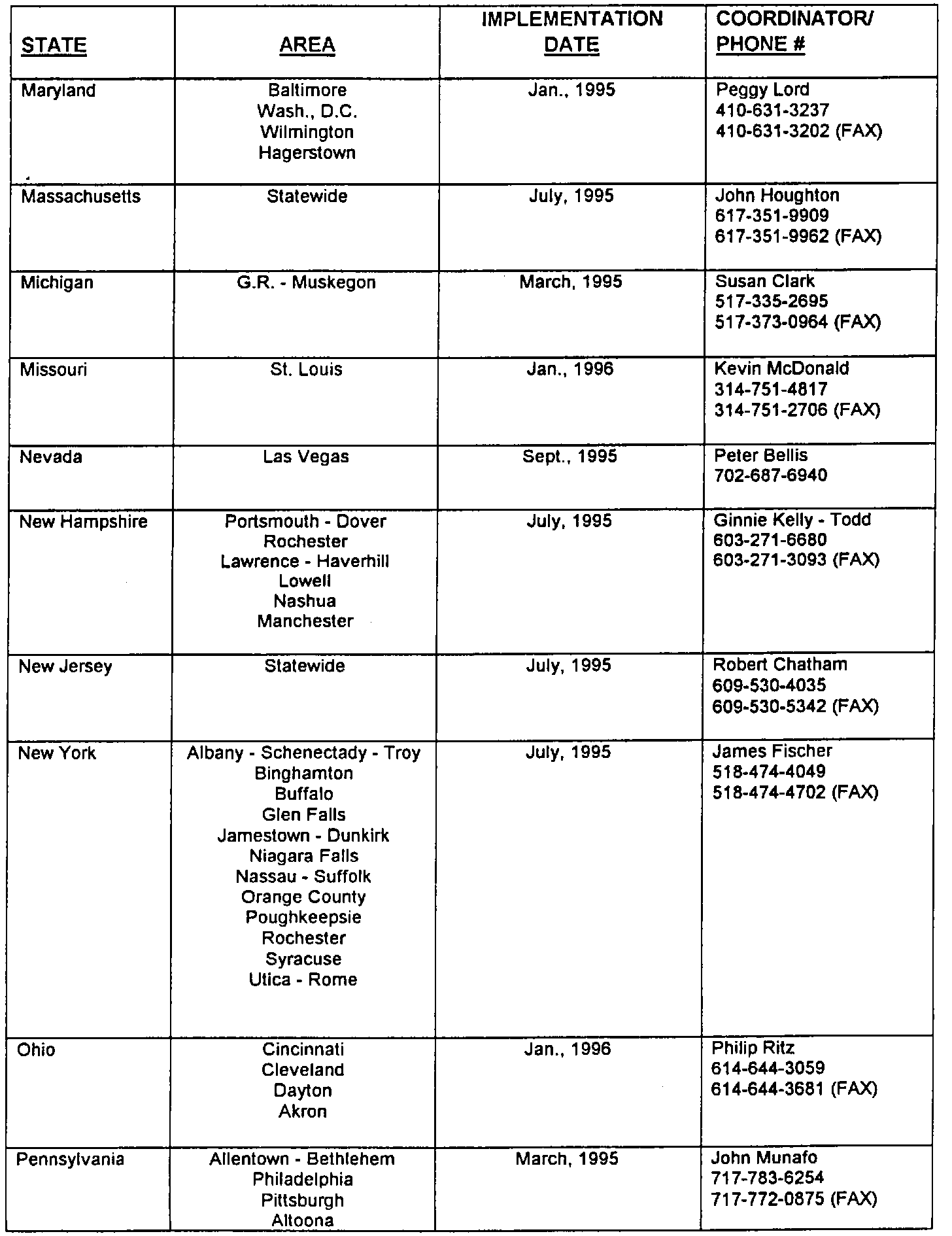 Illustrated are those states which will participate in the Enhanced Emission program as well as a state contact and phone number. In most cases, the test program will be limited to major-urban areas, although some states have elected to implement a statewide program. To ascertain if your facility is affected by this program, refer to the attached list which details those areas affected by the lM240 program along with the projected start dates as declared by each state. Check with your local environmental agency to obtain more detailed information.