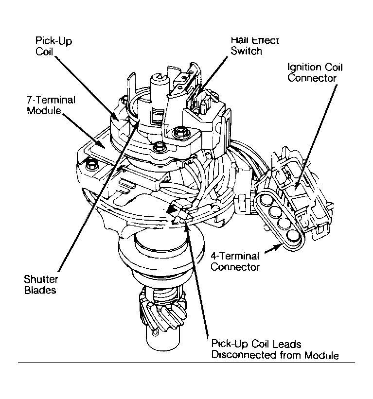 The distributor has neither vacuum nor centrifugal advance mechanisms. See Fig 1 and Fig 2 . The distributor contains a 7-terminal HEI-EST control module, a timer core, pick-up coil, radio noise suppression capacitor, and on most models, an integrally mounted ignition coil, located under the distributor cap's coil cover. Distributors on vehicles equipped with 2.5L VIN 2 and 2.5L VIN R engines also contain a Hall Effect switch and shutter blades.