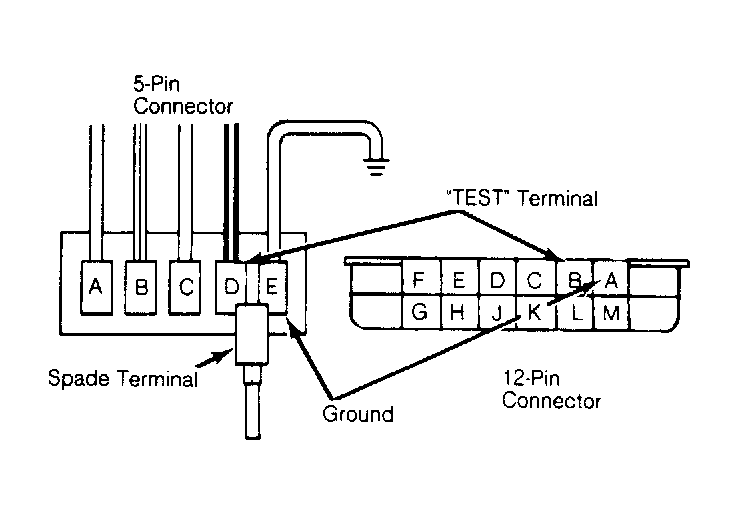 - Turn ignition on (engine off). "CHECK ENGINE" lamp should glow. Locate Assembly Line Data Link (ALDL) connector attached to ECM wiring harness under instrument panel. Insert spade lug terminal across "TEST" terminal and "GROUND" terminal. See Fig 1 .