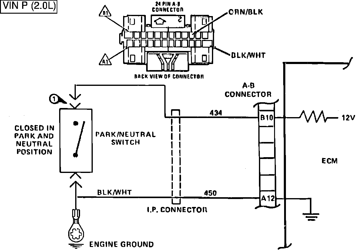 The Park/Neutral Switch is closed to ground in Park or Neutral and open in Drive ranges. The ECM supplies 12 volts through an internal resistor to CKT 434 and senses that the switch is closed when the voltage at terminal B10 drops to less than 1 volt.