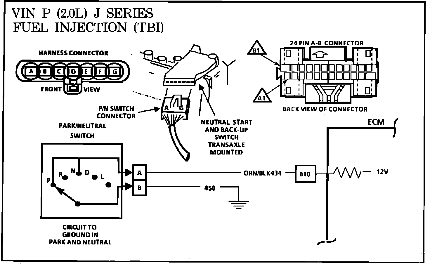 The Park/Neutral Switch contacts are a part of the Neutral Start switch and are closed to ground in park or neutral, and open in drive ranges.