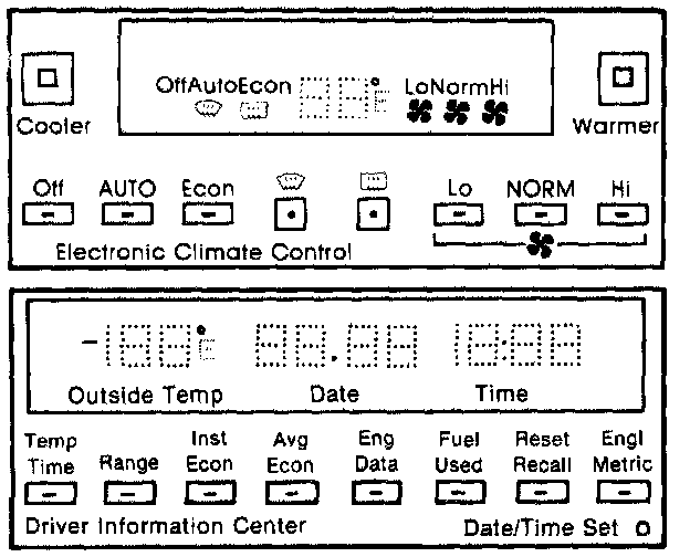 Temperature settings should be used to select the particular setting that is most comfortable, regardless of the outside temperature. These settings work much the same way as a house thermostat. Settings are spaced out between 65°F and 85°F with increments of 1°F. To change temperature settings, press the "WARMER" or "COOLER" button until the temperature setting you wish is displayed. When a temperature of 65 is selected, and the "COOLER" button is touched, the system goes to 60, or max cool. This means that the system will control to the coolest air delivery possible for the selected mode. This will continue until another temperature setting is selected. Cooling cannot occur if the mode selected is "OFF" or "ECON", as in these settings the compressor will not run. The opposite is also true, if 85 is selected and the "WARMER" button is touched, the system goes to 90, or max heat, and will control to the warmest air delivery possible for the selected mode. This will continue until another temperature setting is selected.