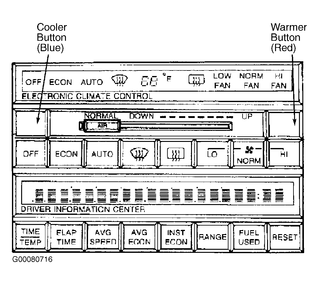 - Upon entering diagnostic mode, the climate control will operate in whatever mode was being commanded just prior to depressing the "OFF" and "WARM" buttons. Even though display may change just as buttons are touched, the prior operating mode is remembered and will resume after diagnostic mode is entered. The Extended Compressor at Idle (ECI) is not allowed while in diagnostic mode. This allows observation of system parameters during normal compressor cycles.