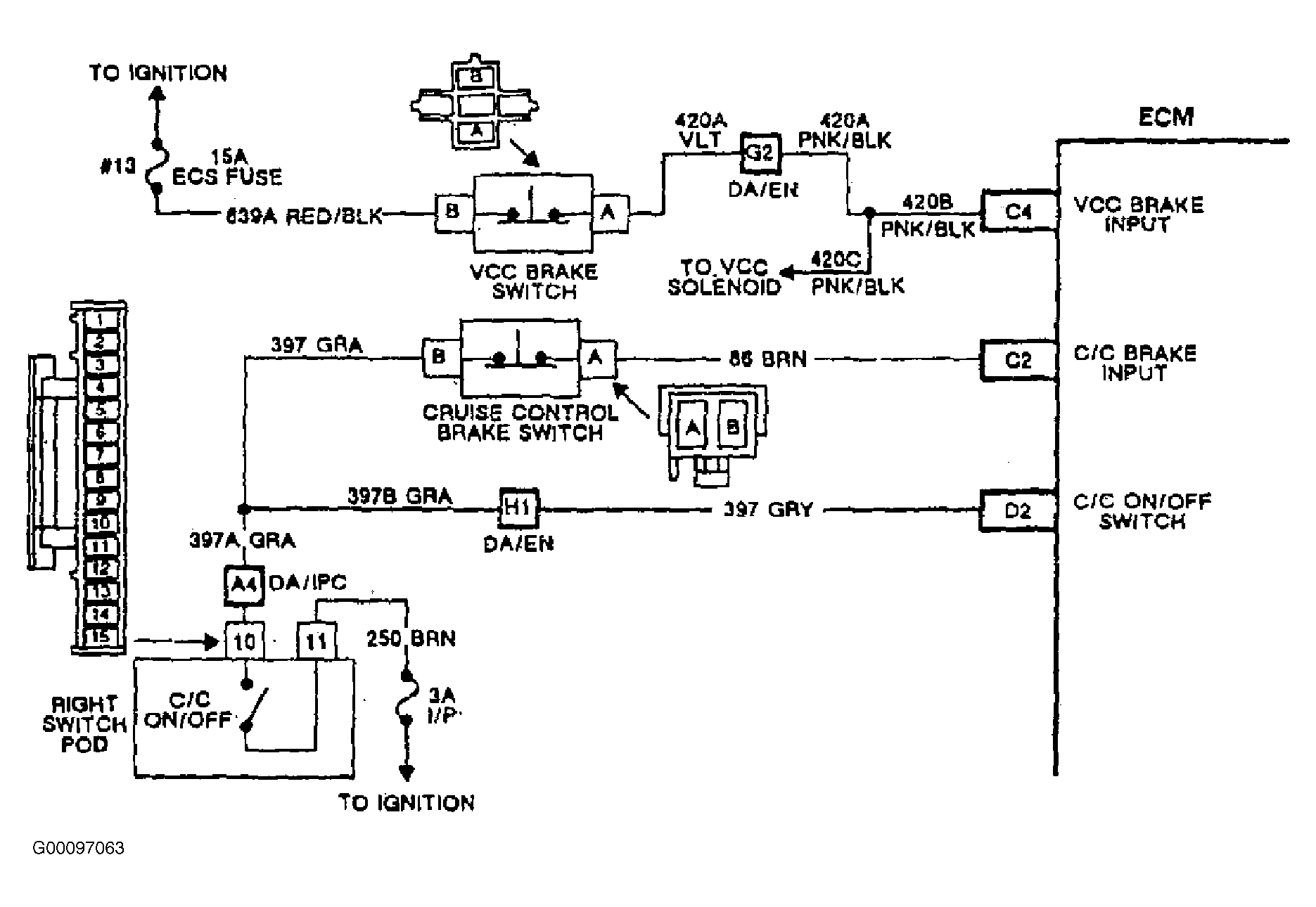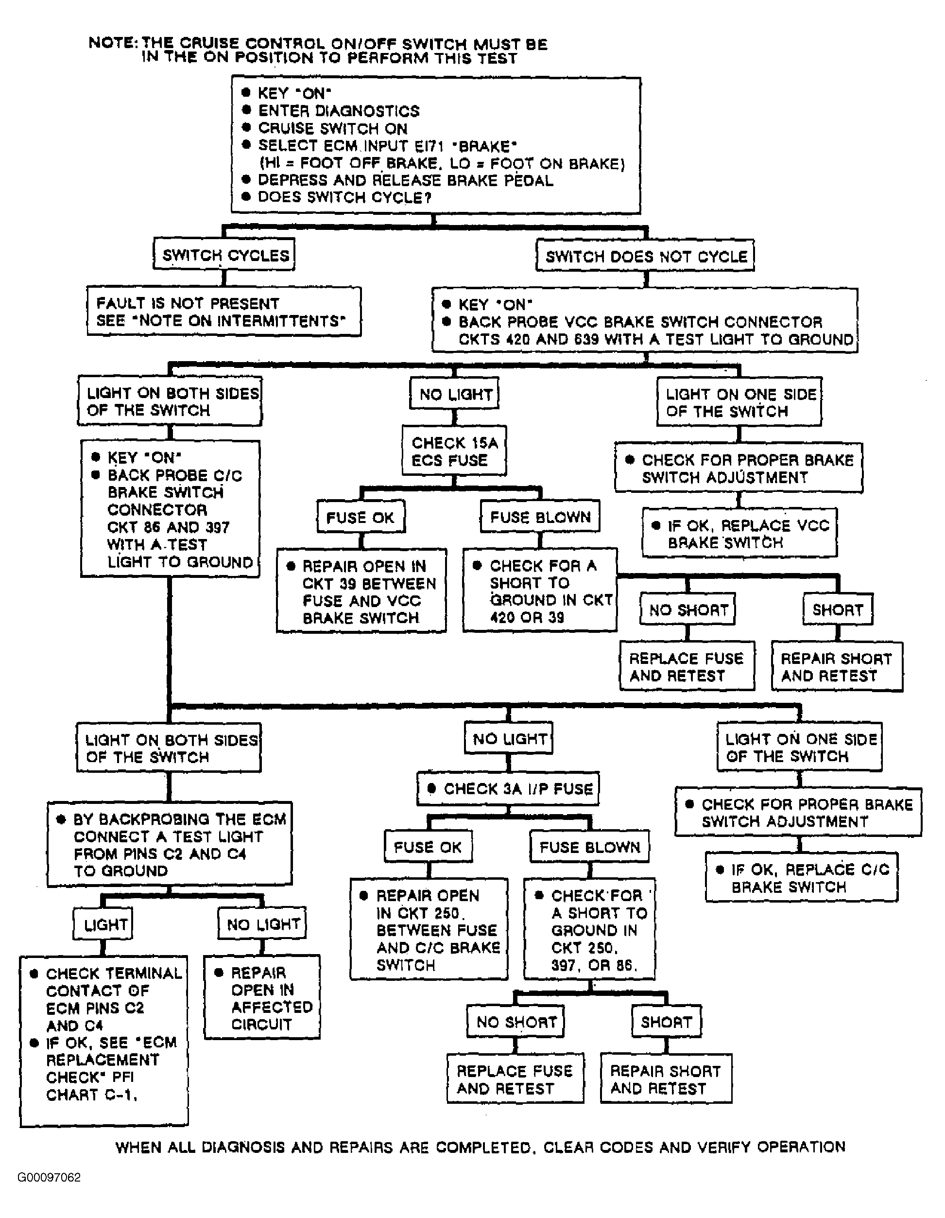 Check switch for proper adjustment. Check for intermittent open circuit on circuits No. 86 and 420 from brake switches to ECM. Turn cruise On/Off switch off and manipulate wiring for circuit. No. 420. If ECM input EI71 jumps from "HI" to "LO", repair intermittent connection in circuit No. 86. If the 15-amp or 3-amp ECS fuse is being blown intermittently, check circuits No. 86 and 420 for intermittent shorts to ground.
