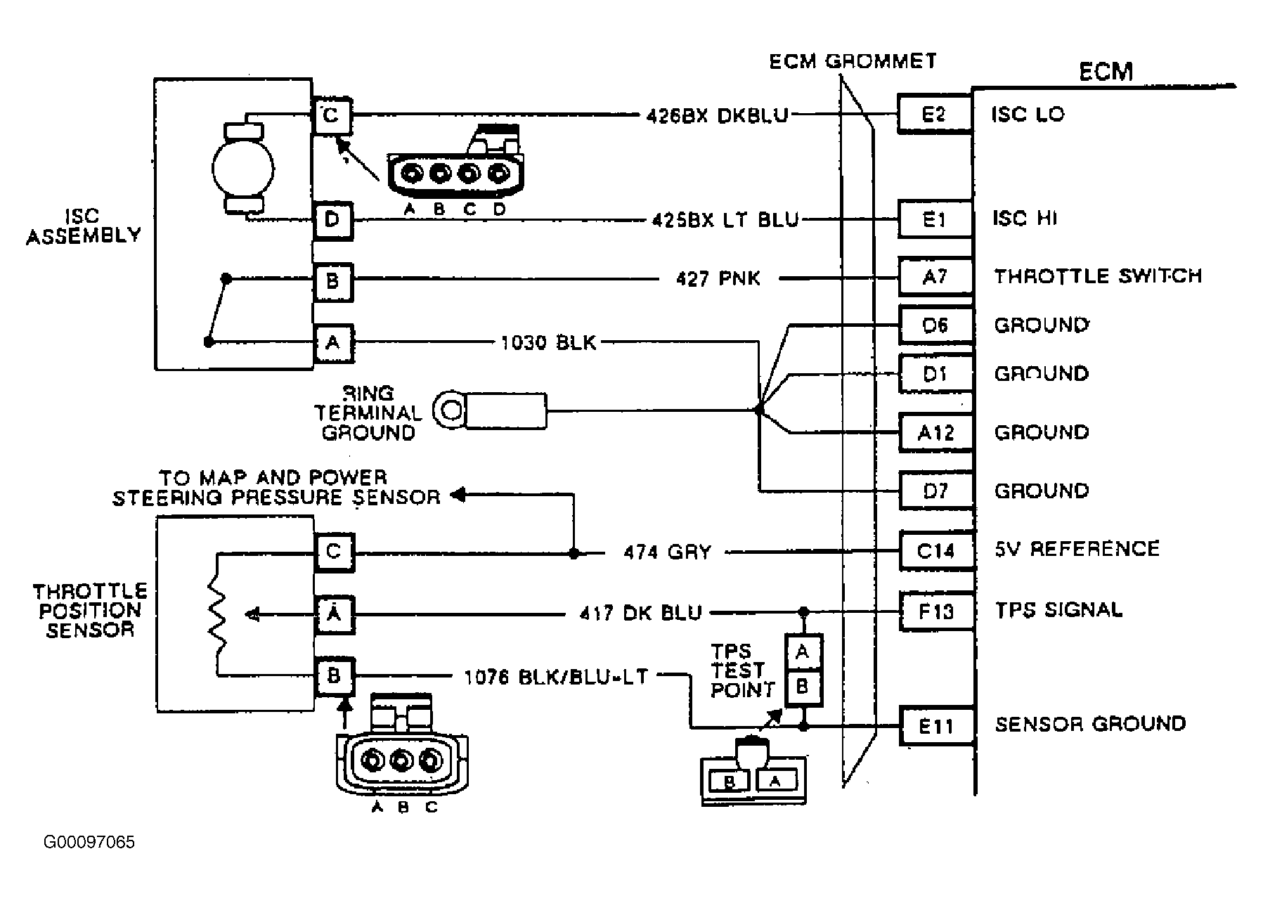 Probe ECM pin "A7" to ground with a voltmeter. Manipulate wiring and connectors at closed throttle and watch for 5.0 volts, indicating an open from "A7" to ground. Manipulate wiring and connectors at open throttle and watch for zero volts, indicating short to ground on circuit No. 427.