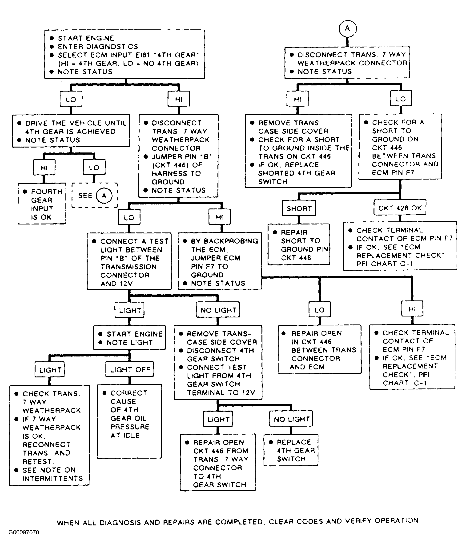 Manipulate switch wiring while observing the "°F" status light. If the fault is induced, the "°F" light will flash on. Repair intermittent open in. Circuit No. 446.